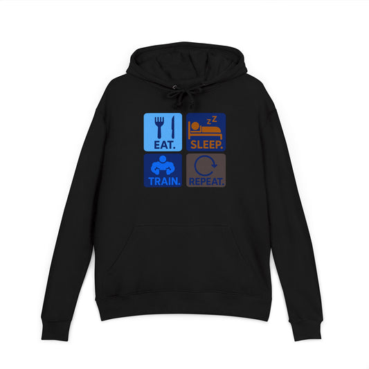 "EAT.SLEEP.TRAIN.REPEAT." Statement Hoodie for Fitness Lovers, Cozy Workout Gear, Athletic Hoodie, Motivational Hoodie, Gym Apparel