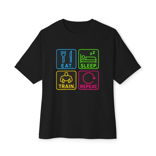 "EAT.SLEEP.TRAIN.REPEAT." Active Lifestyle Oversized Tee, Gym Shirt, Fitness Motivational Tee, Workout Top, Casual Wear, Gift for Athletes, Unisex Boxy Tee