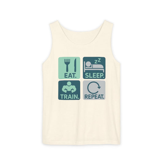 "EAT.SLEEP.TRAIN.REPEAT." Active Lifestyle Tank Top - Gym Wear, Fitness Apparel, Workout Shirt, Casual Summer Top, Gift for Athletes