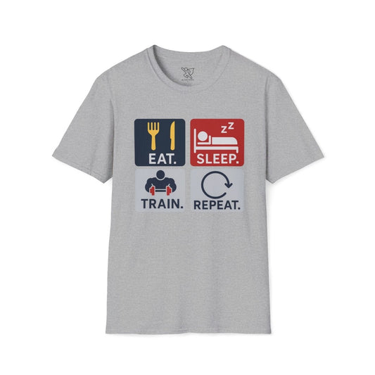 "EAT.SLEEP.TRAIN.REPEAT." Witty T-Shirt, Fitness Humor Tee, Workout Gift, Gym Apparel, Unisex Activewear, Inspirational Sports Shirt