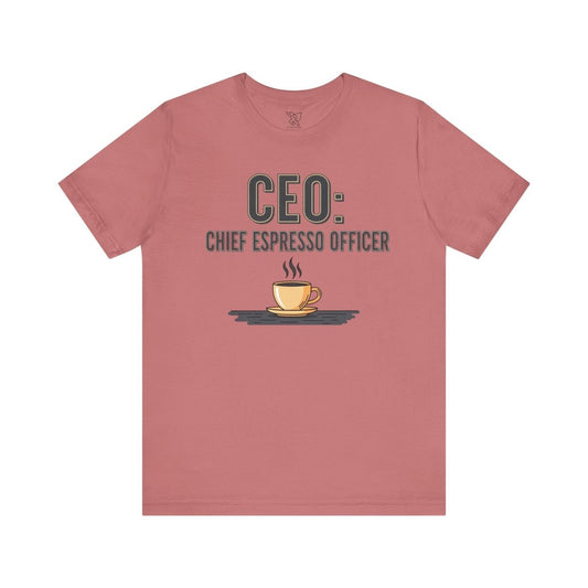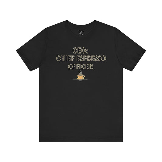 "CEO: Chief Espresso Officer" CW-1 Unisex Jersey T-Shirt for Baristas, Funny Coffee Shirt for Gifts, Perfect for Birthdays, Coffee Shop Outfits
