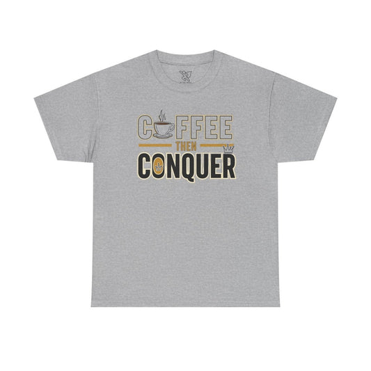 "Coffee Then Conquer" Unisex Heavy Cotton Tee | Motivational Tee Shirt, Gift for Coffee Lovers, Daily Motivation, Relaxed Fit Apparel