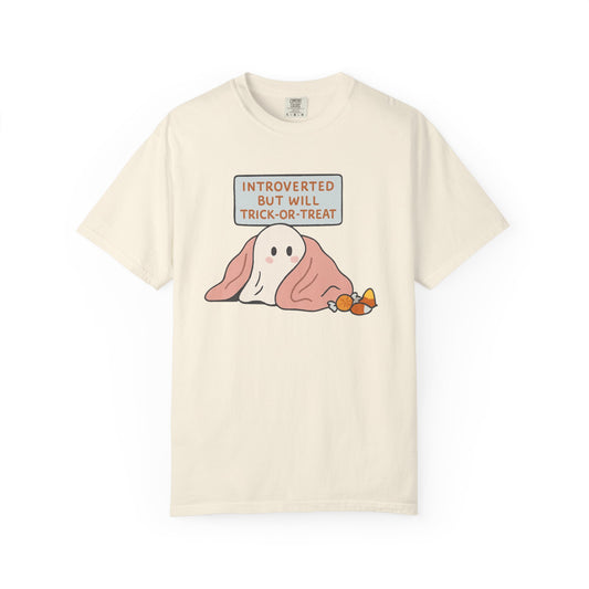"Introverted But Will Trick or Treat" Unisex Halloween Tee, Funny Trick-or-Treat Shirt, Spooky Season Apparel, Gift for Introverts