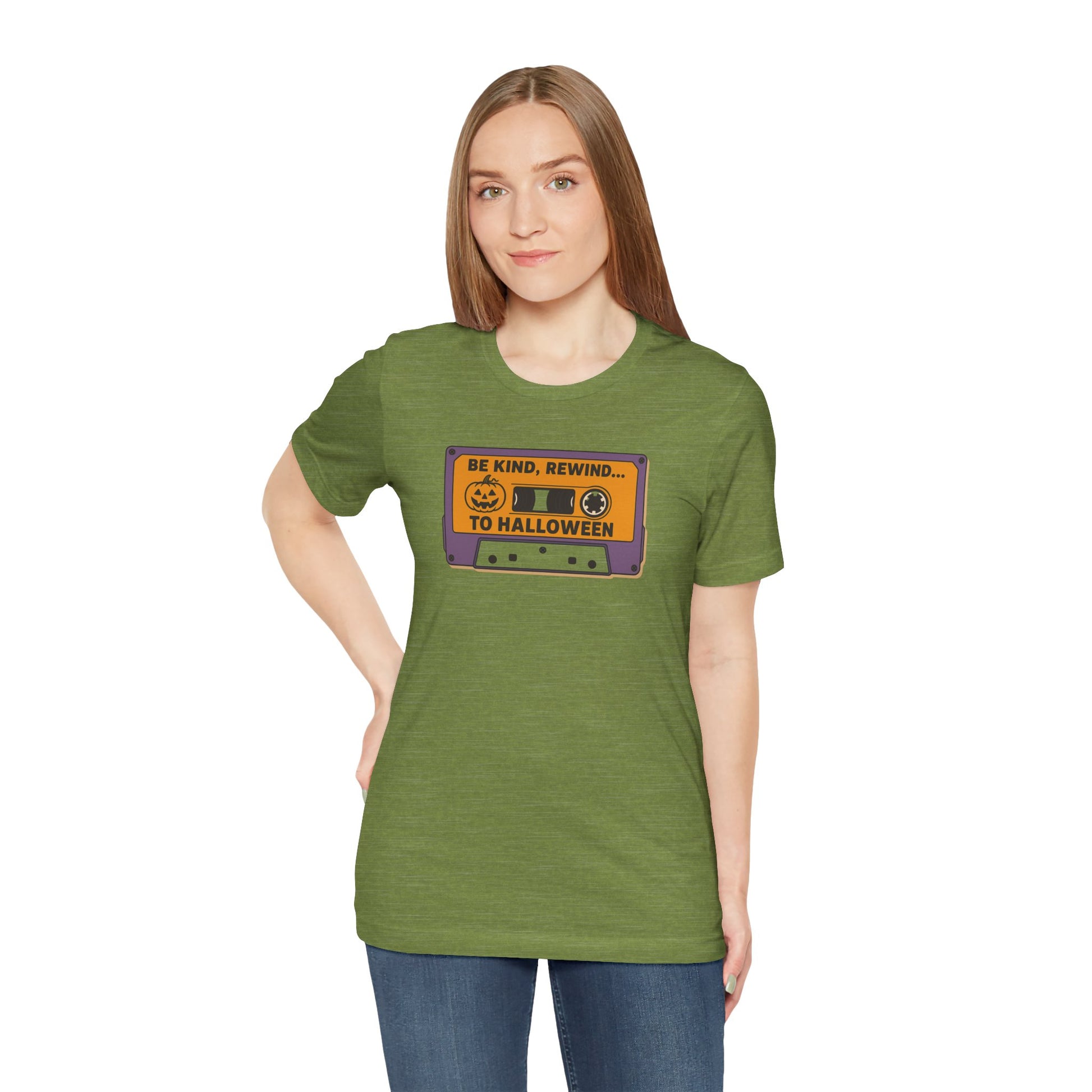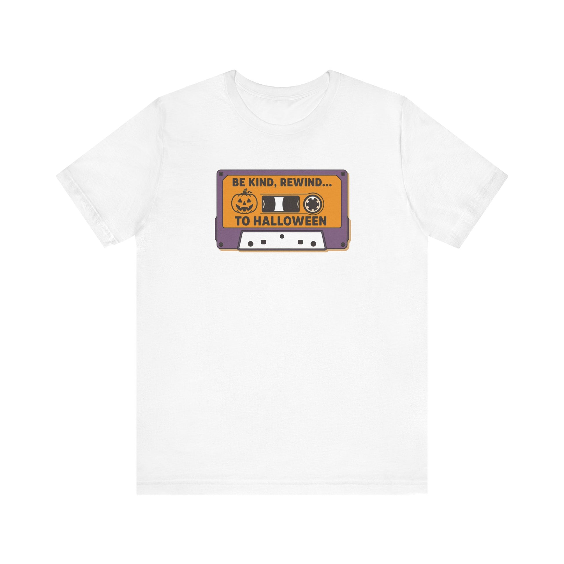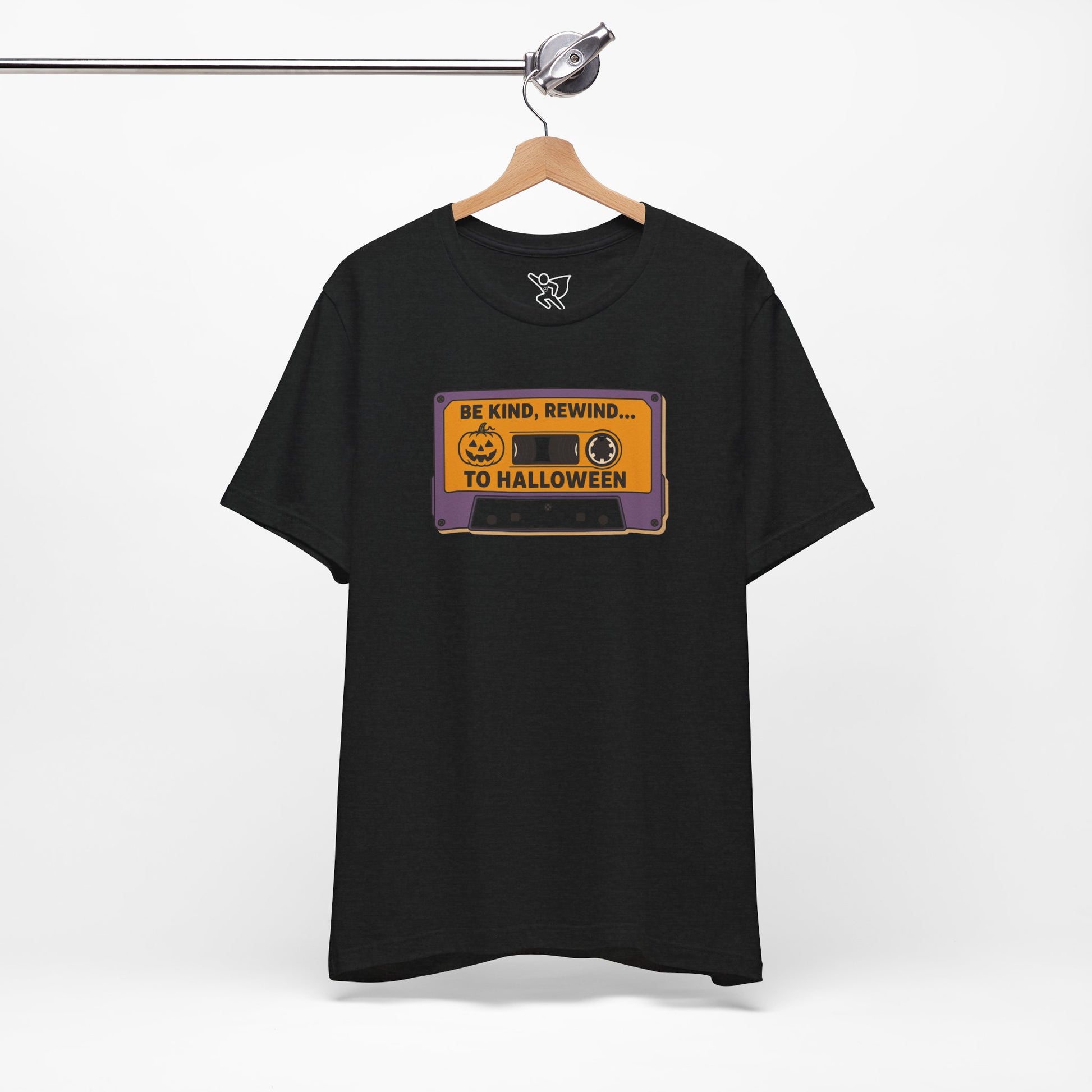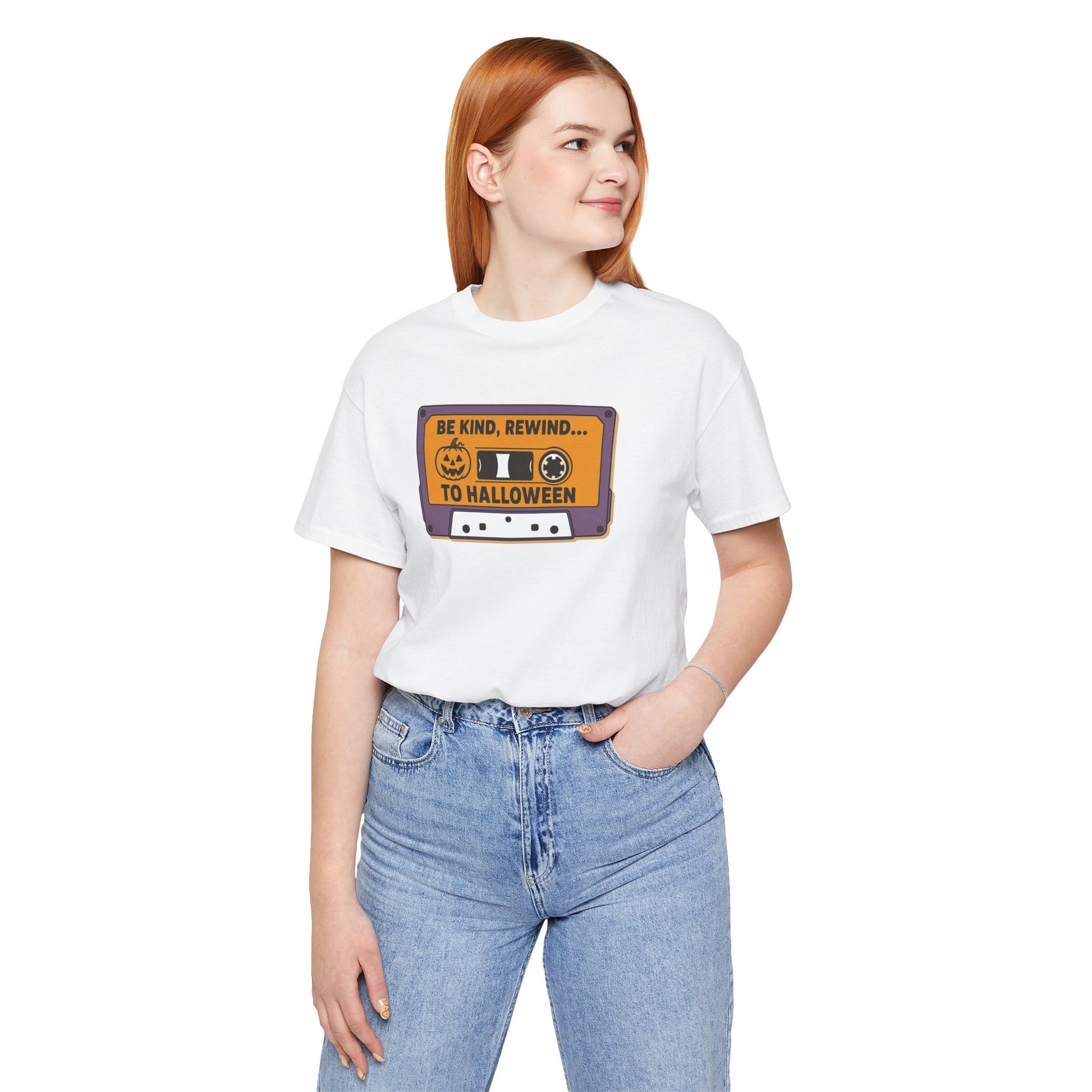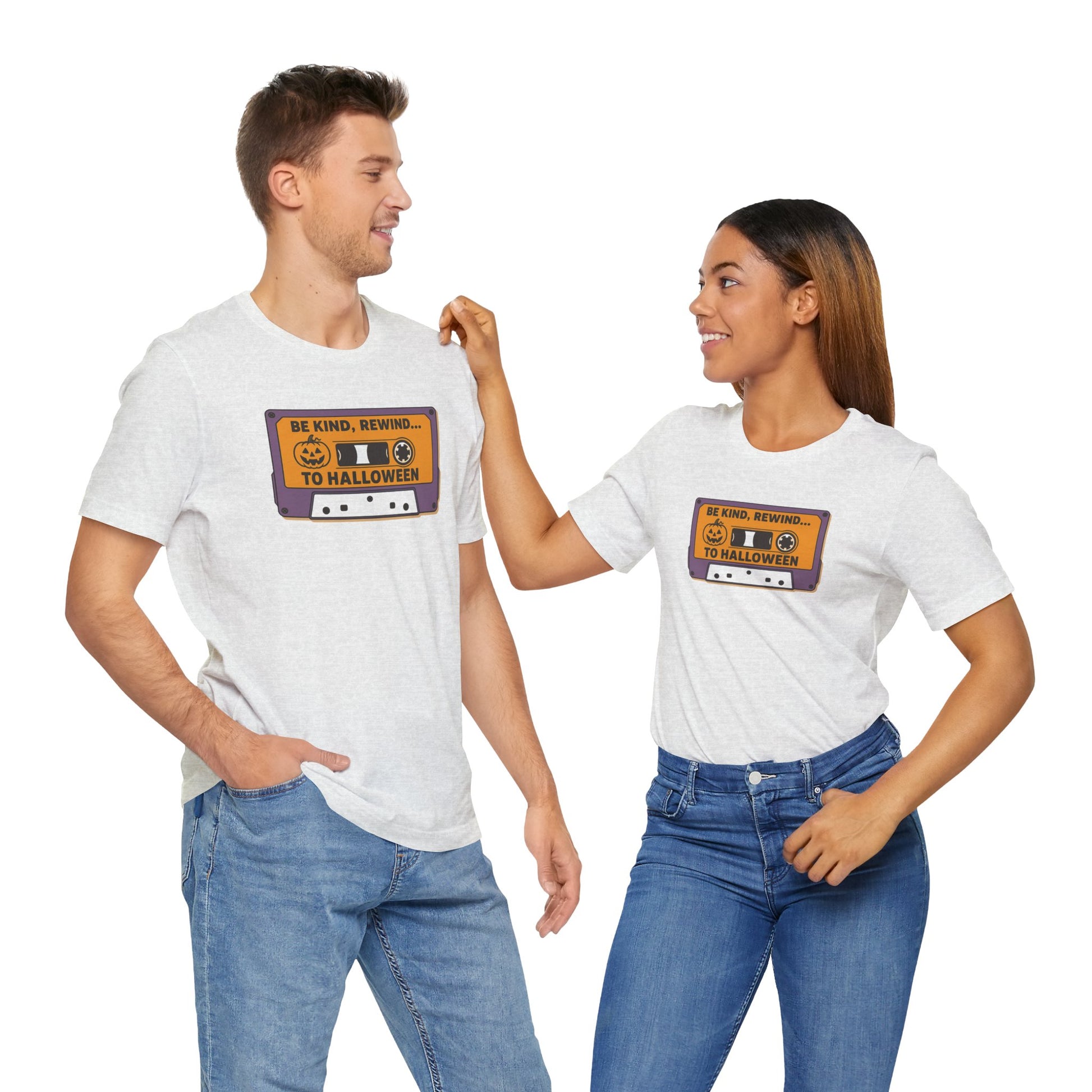 "Be Kind, Rewind to Halloween" T-Shirt, Unisex Casual Wear, Spooky Season Top, Vintage Style Shirt