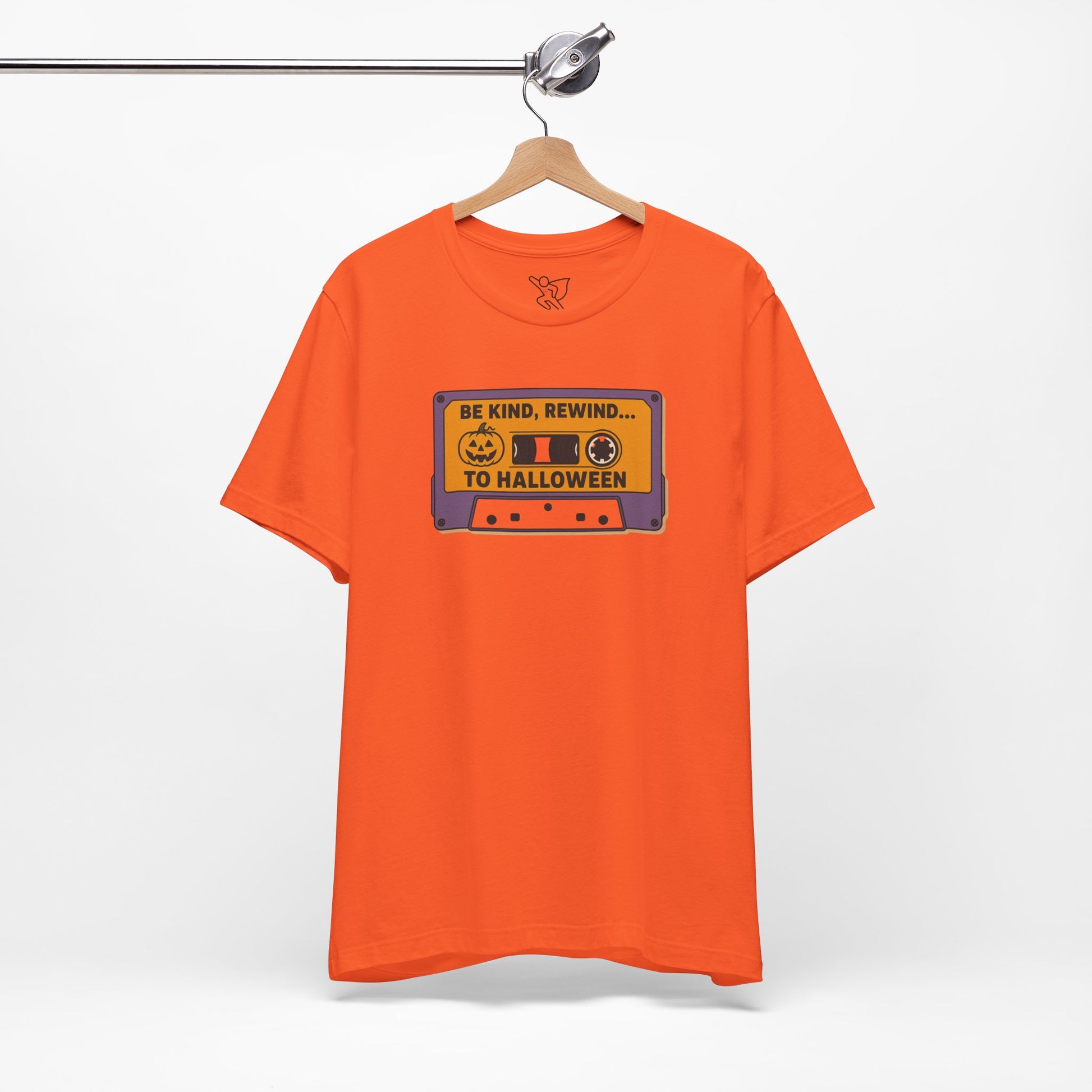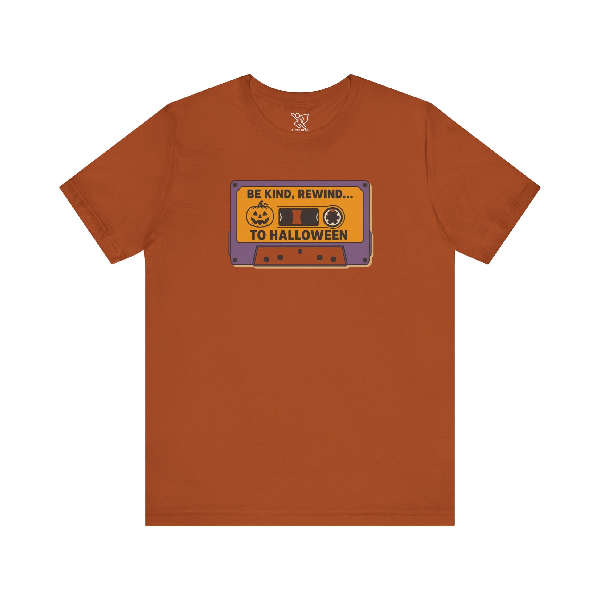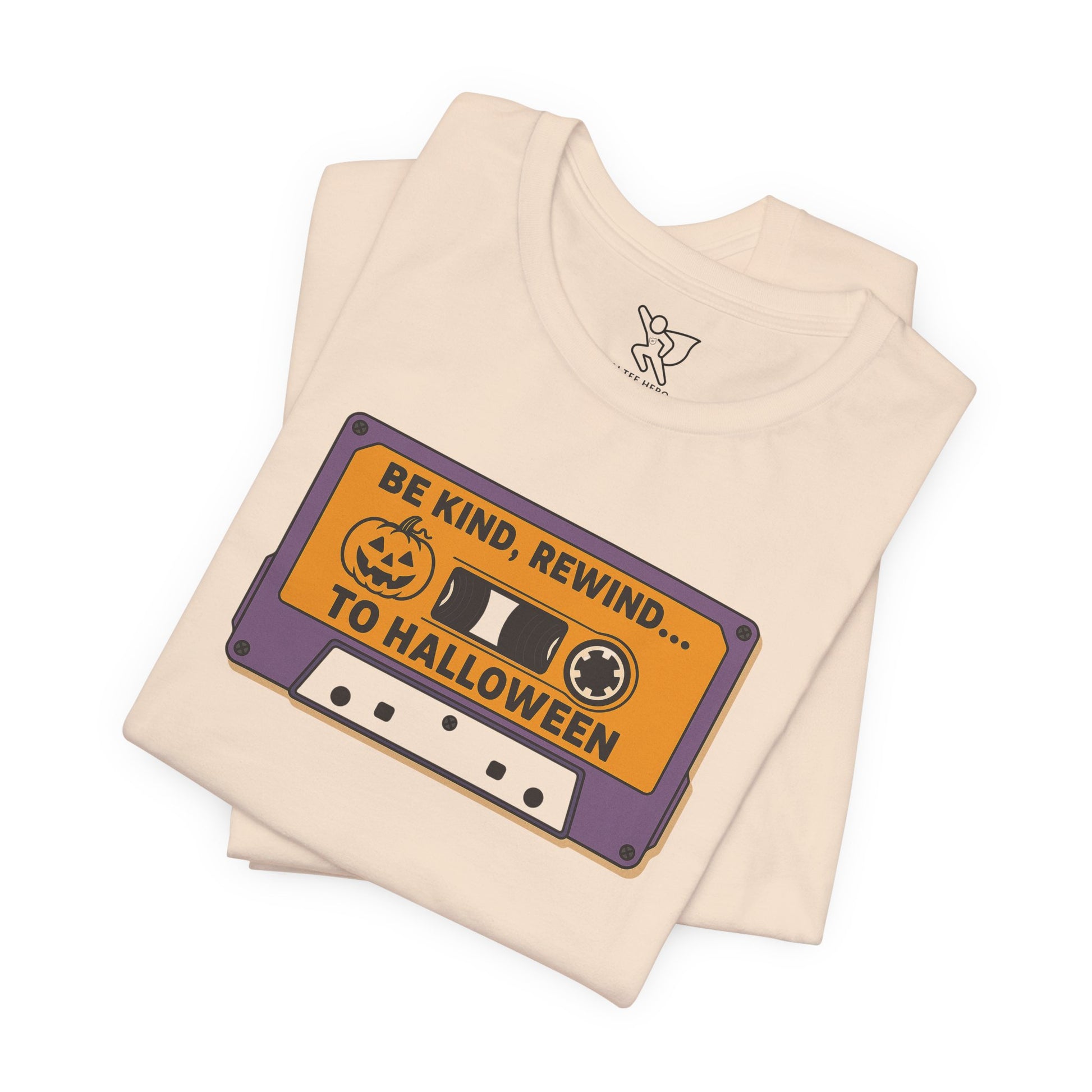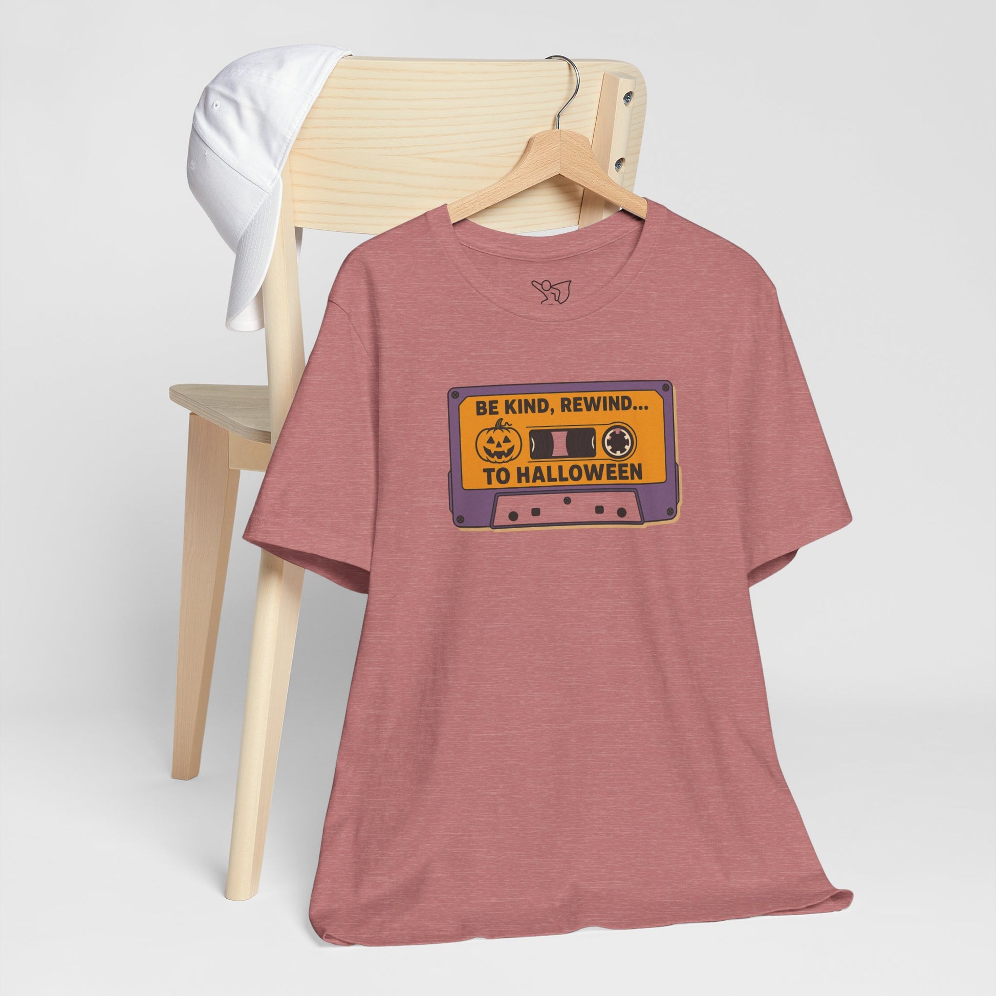 "Be Kind, Rewind to Halloween" T-Shirt, Unisex Casual Wear, Spooky Season Top, Vintage Style Shirt