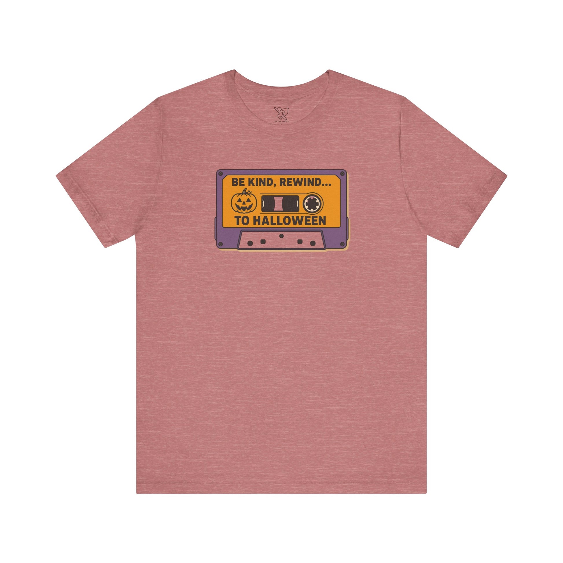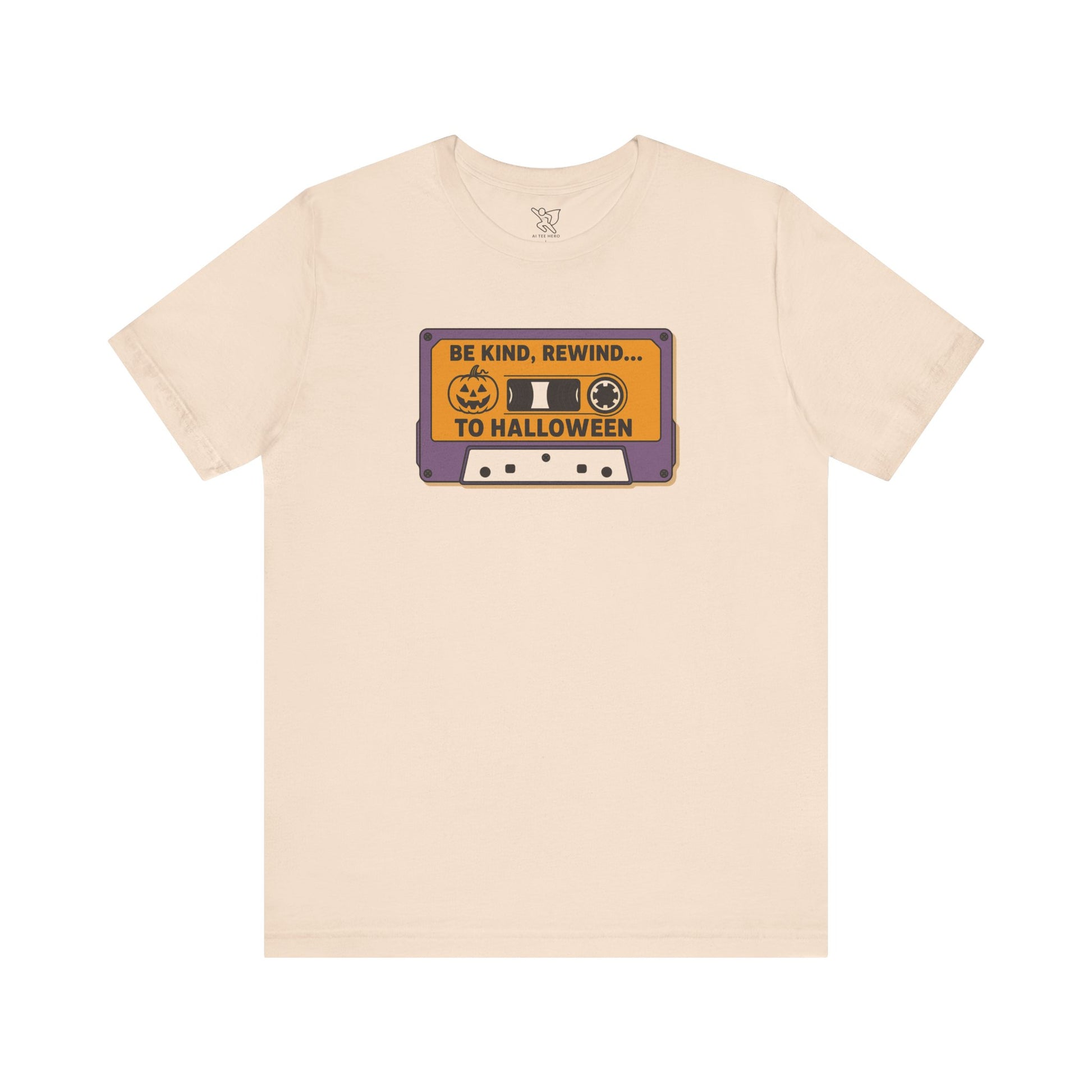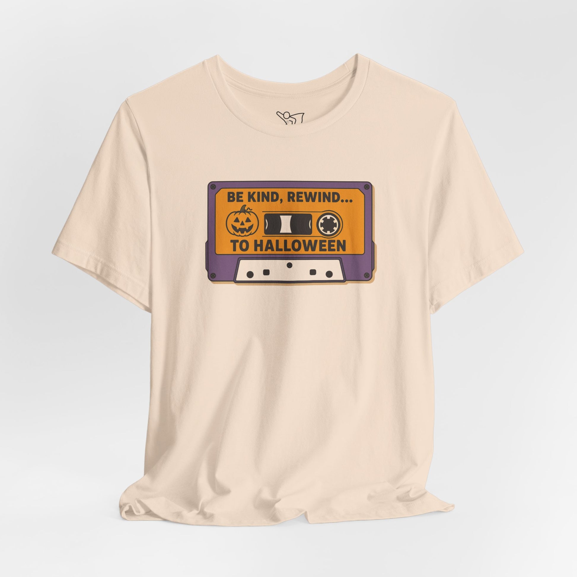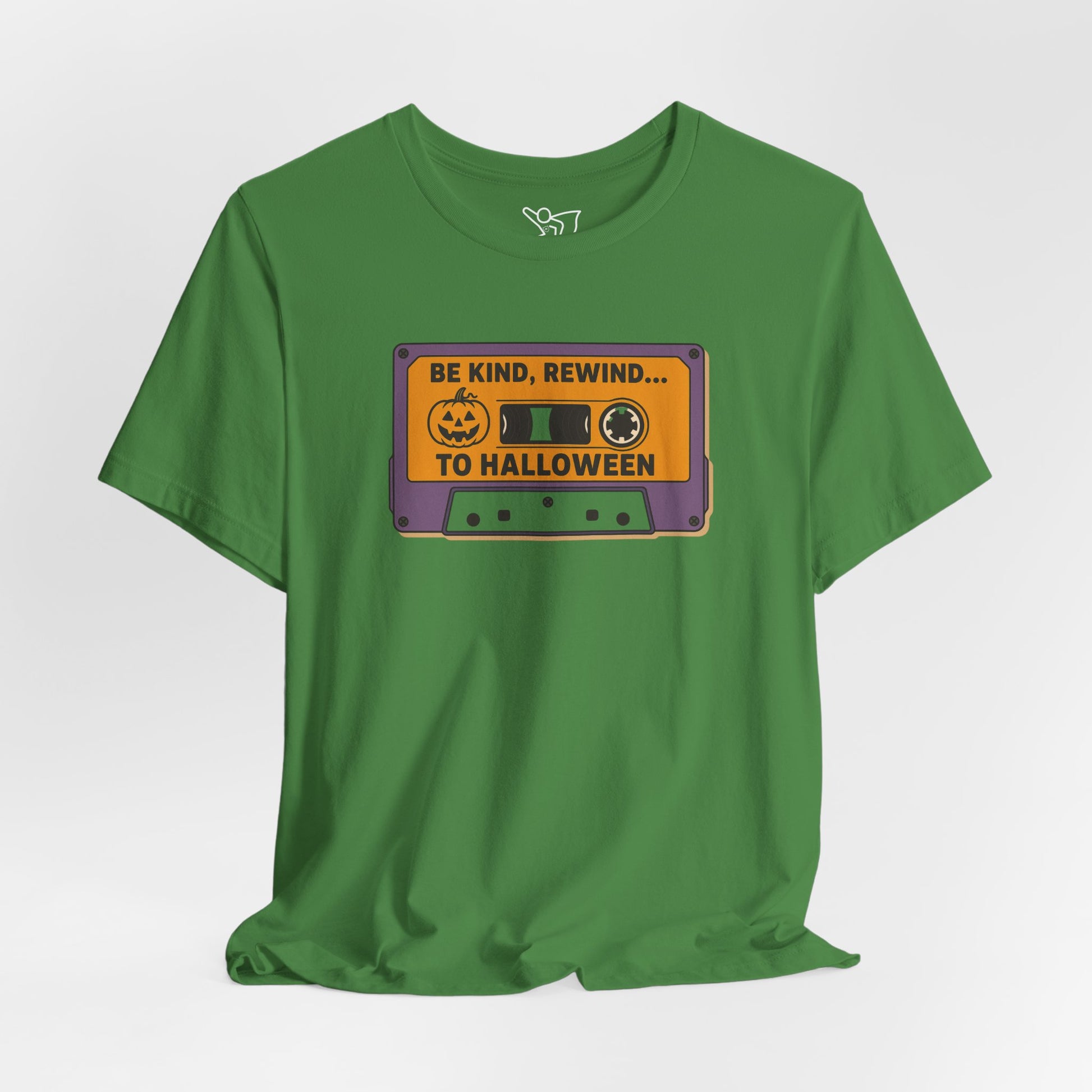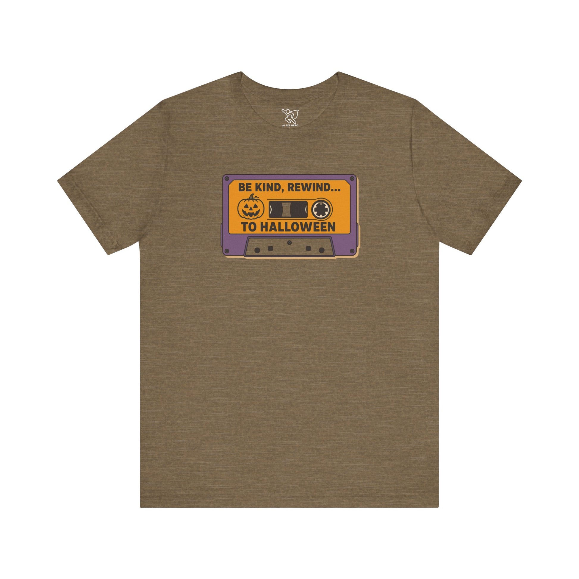 "Be Kind, Rewind to Halloween" T-Shirt, Unisex Casual Wear, Spooky Season Top, Vintage Style Shirt