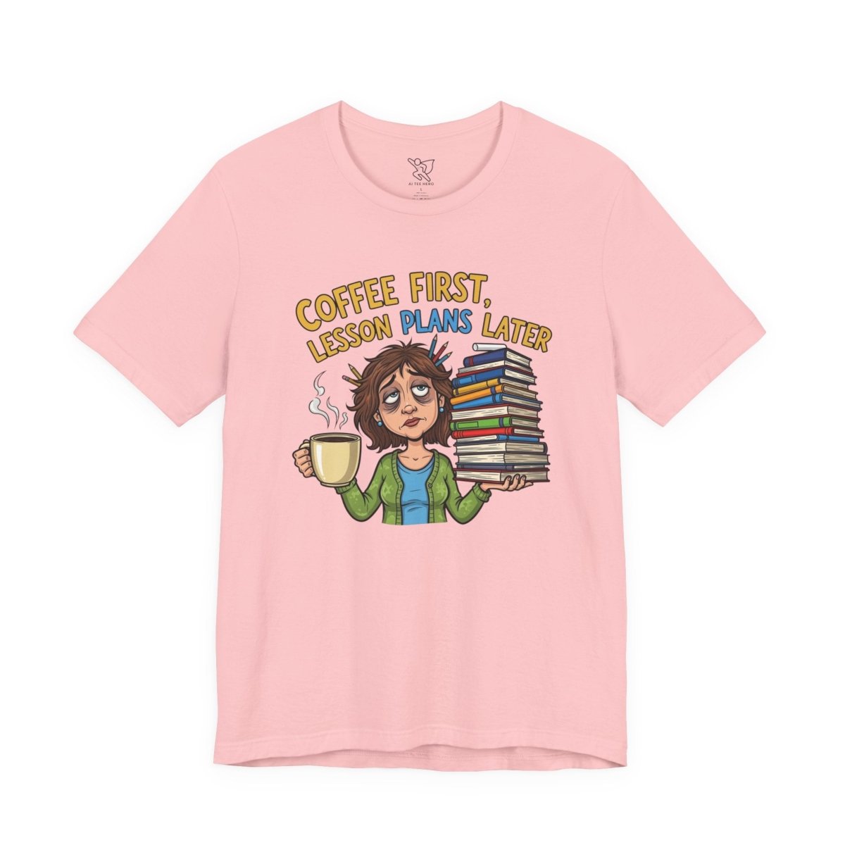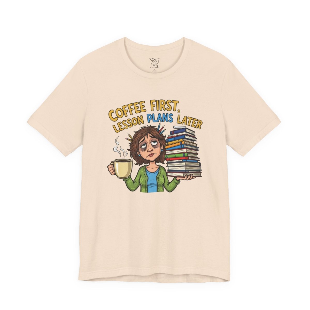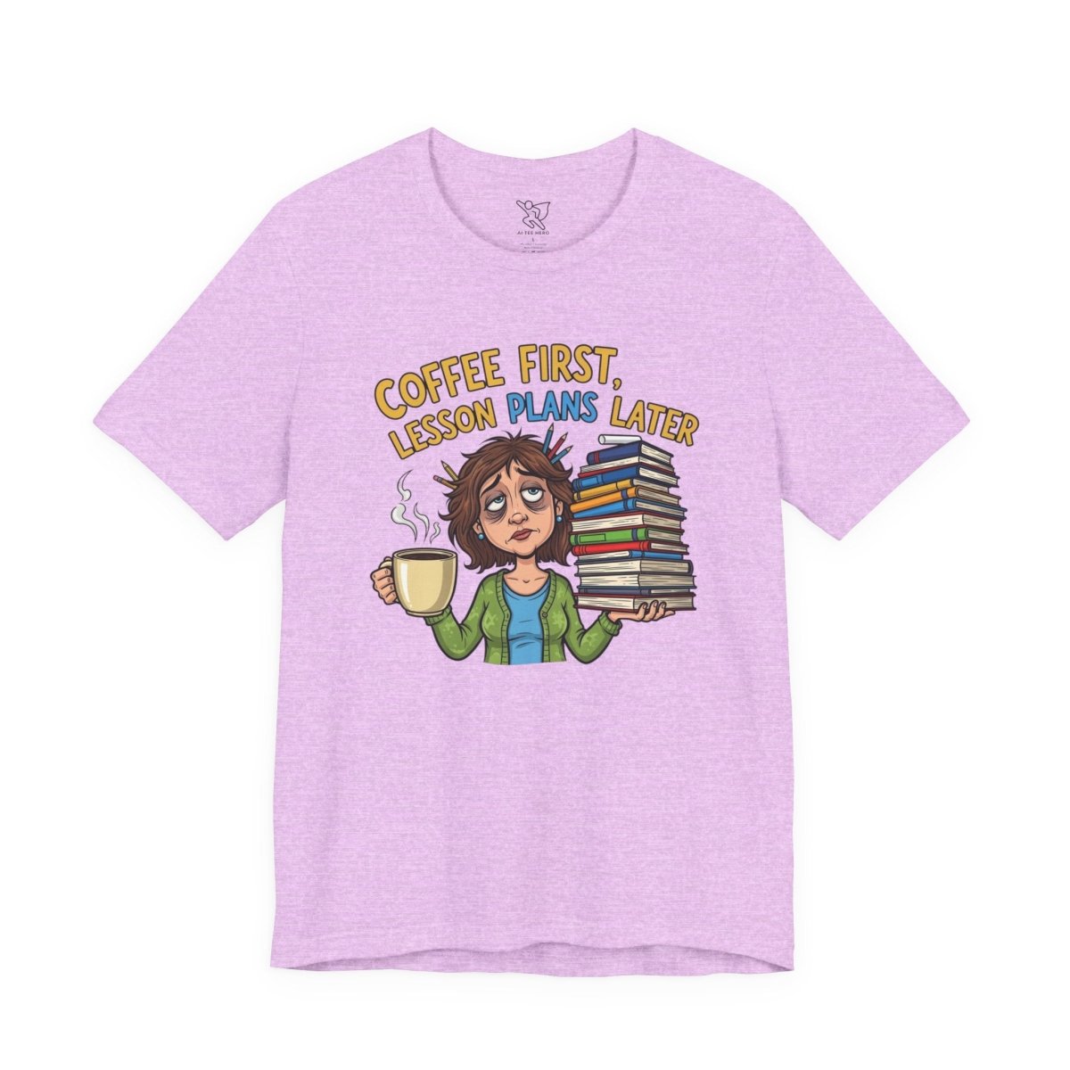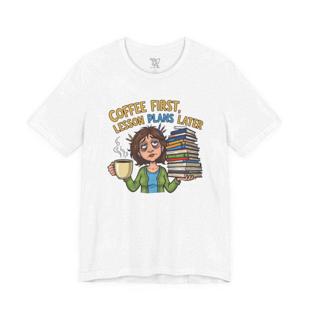 "Coffee First, Lesson Plans Later" CW 1 - Tee for Teachers, Funny Teacher Appreciation Gift, Unisex Jersey Tee, Back to School Shirt, Classroom Humor Apparel