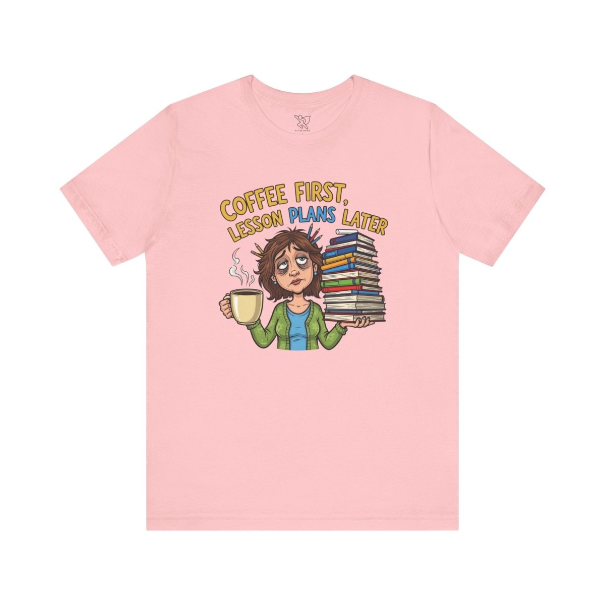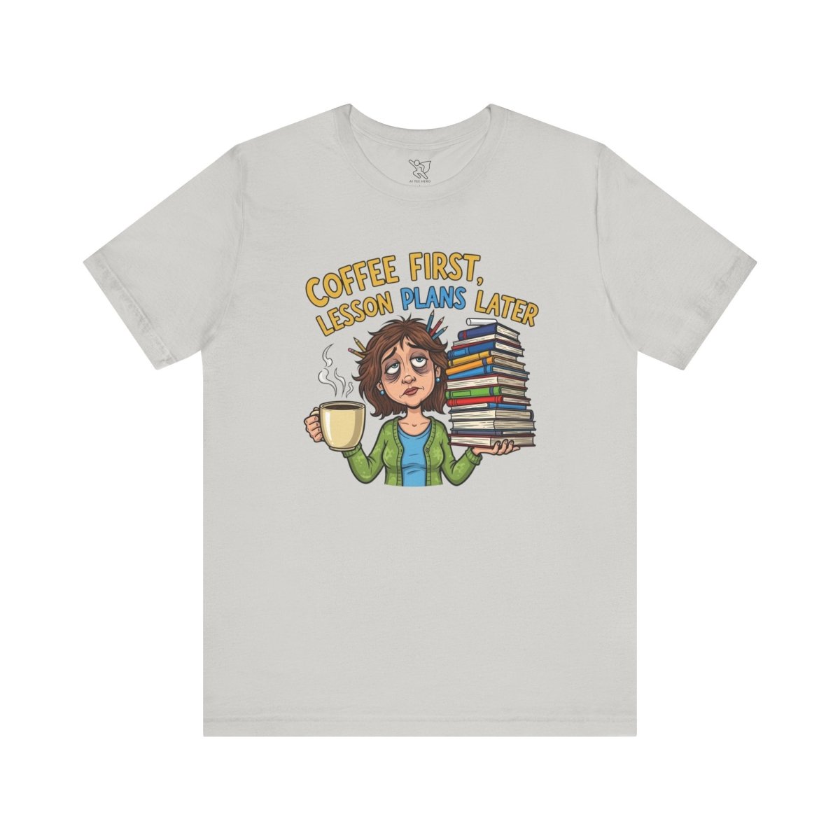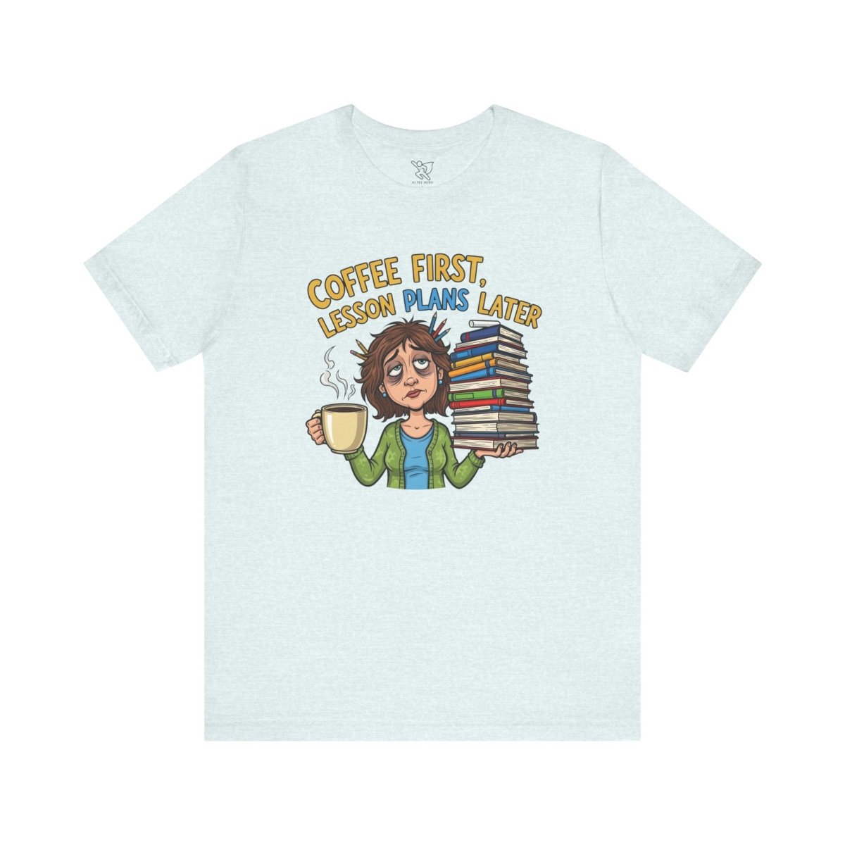 "Coffee First, Lesson Plans Later" CW 1 - Tee for Teachers, Funny Teacher Appreciation Gift, Unisex Jersey Tee, Back to School Shirt, Classroom Humor Apparel