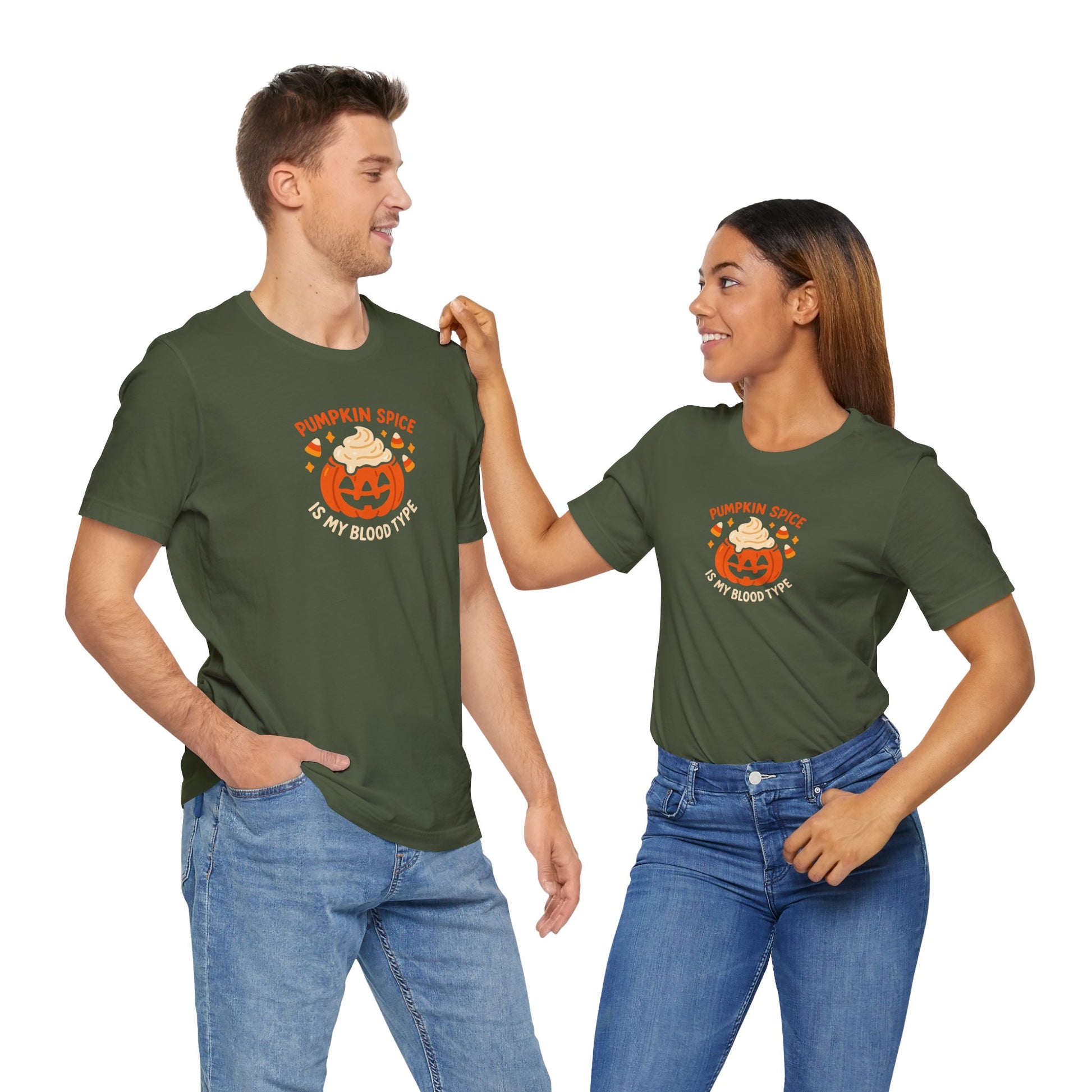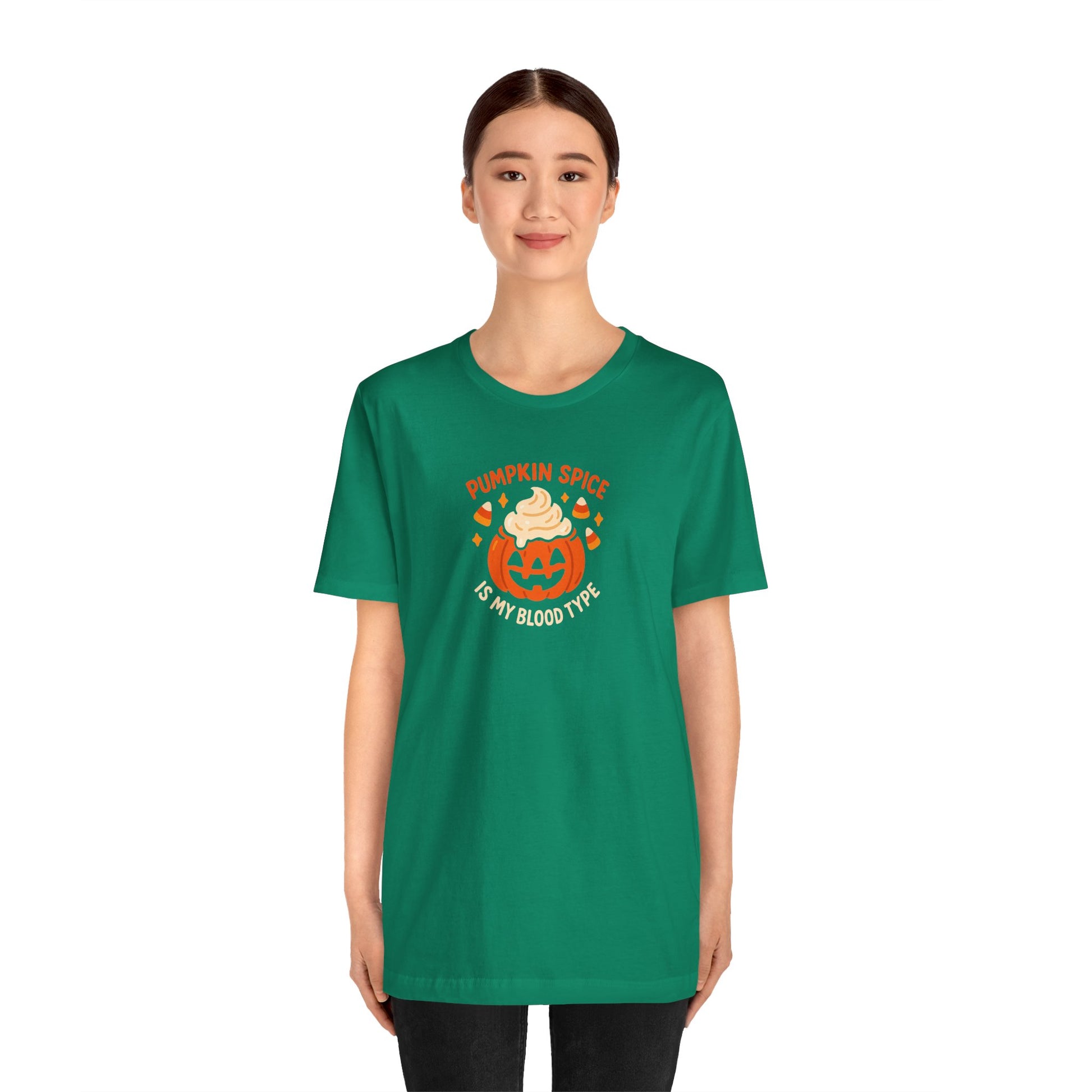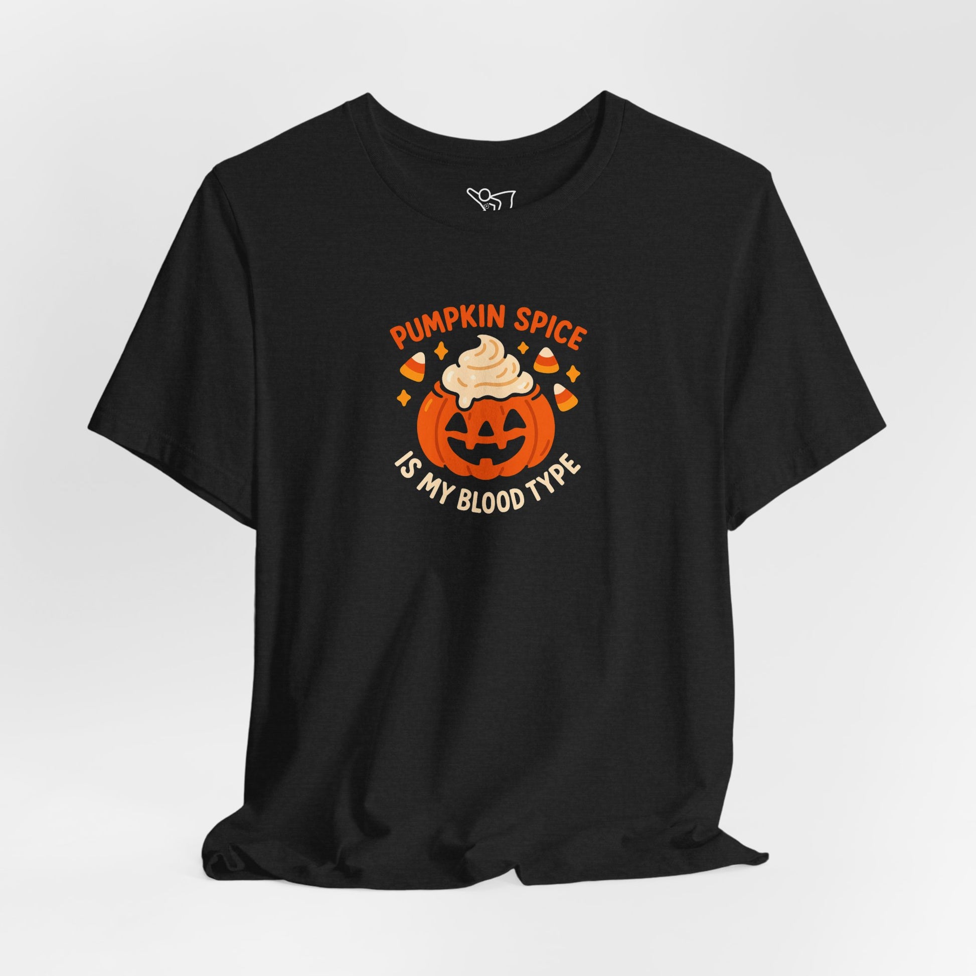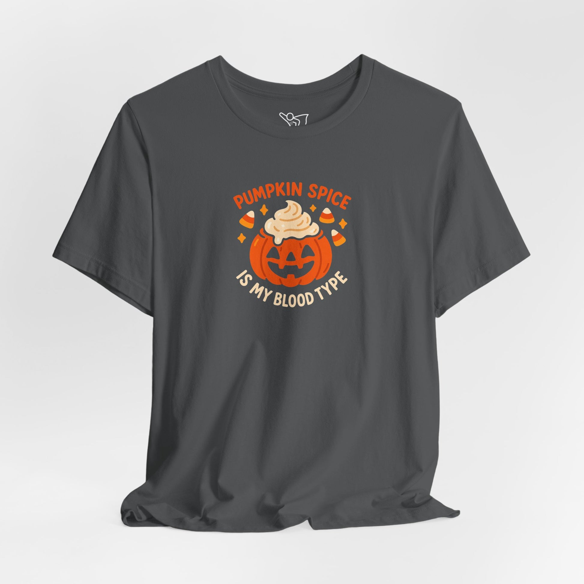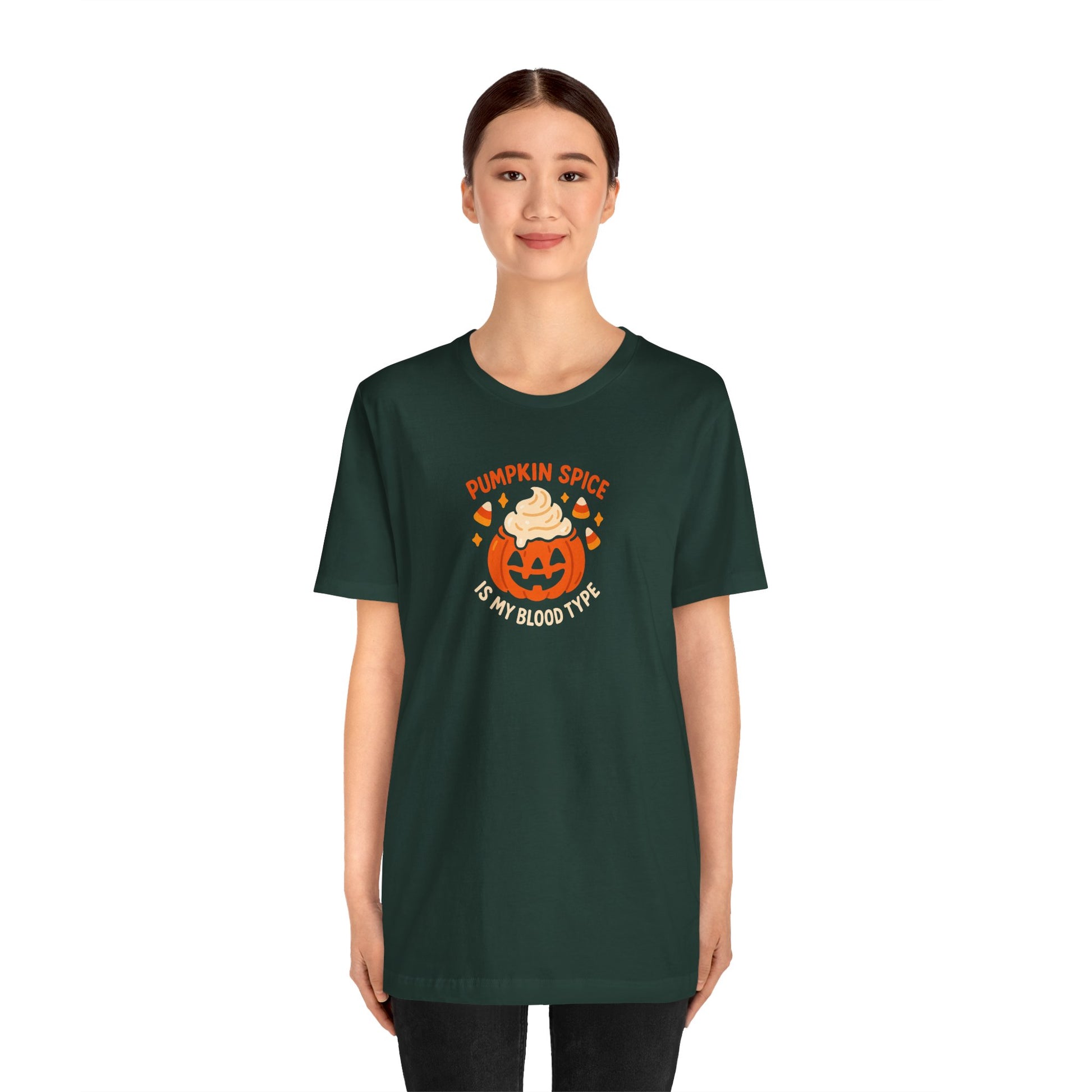 "Pumpkin Spice is My Blood Type" Short Sleeve Tee Fall Fashion, Halloween Shirt, Coffee Lover Gift, Autumn Wardrobe, Seasonal Tee