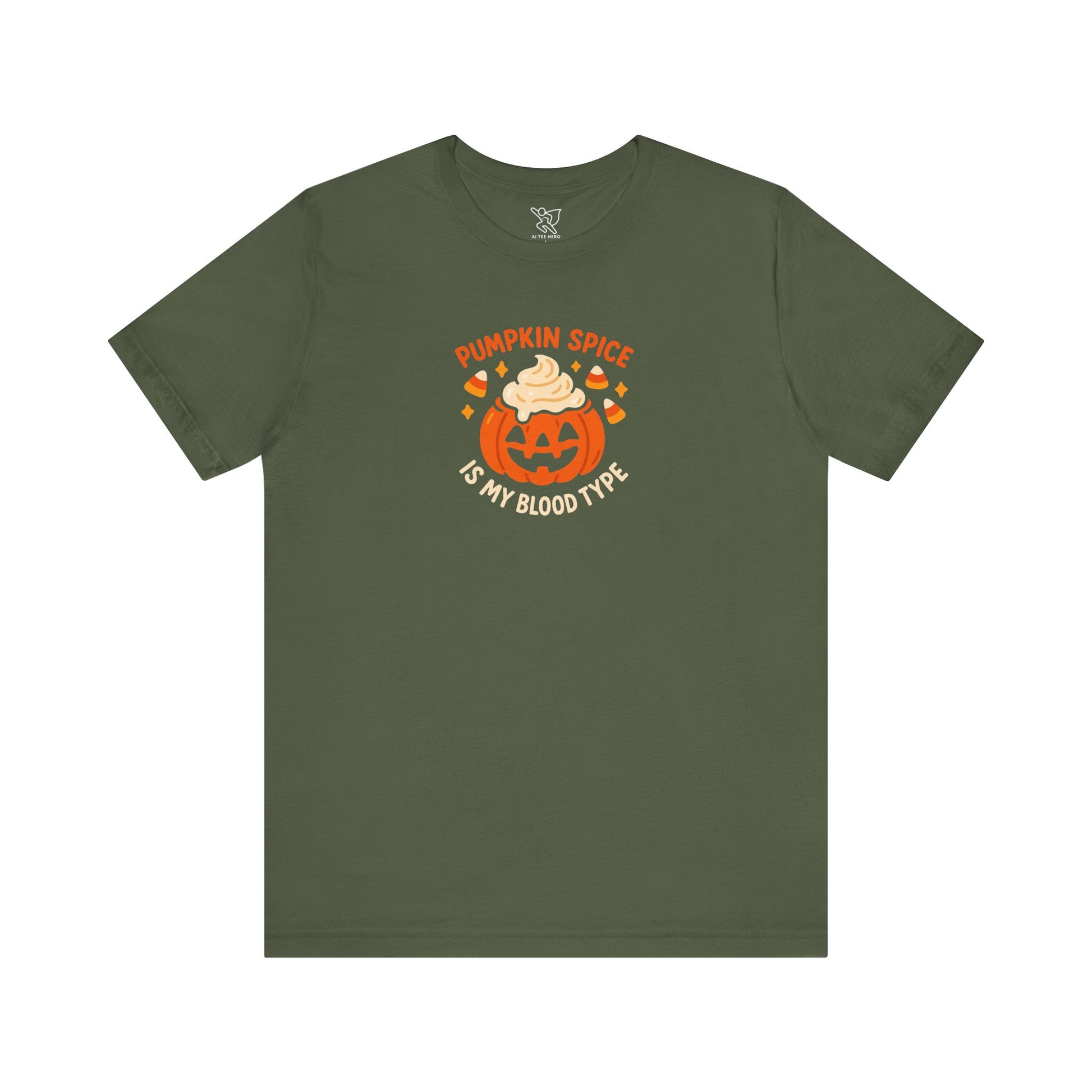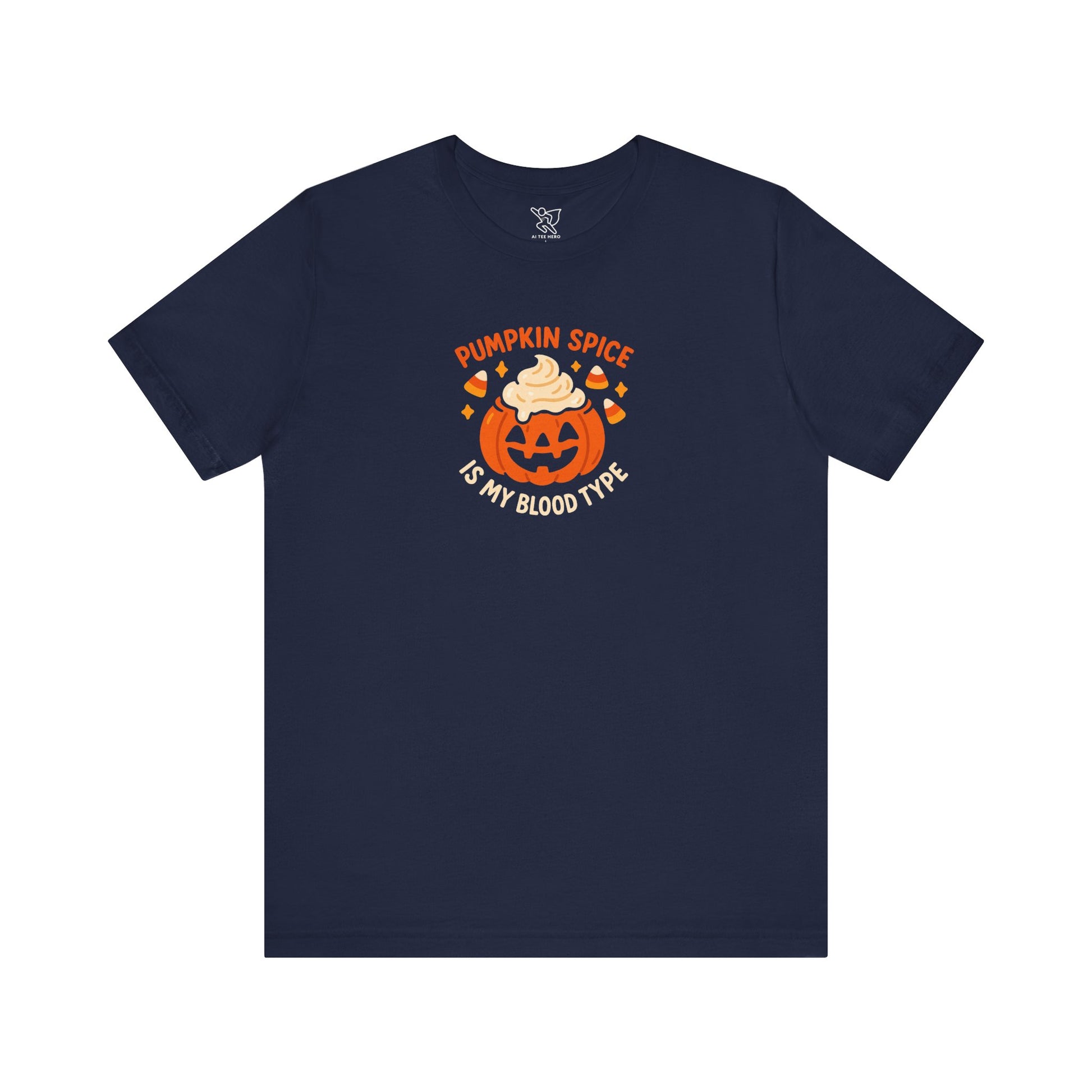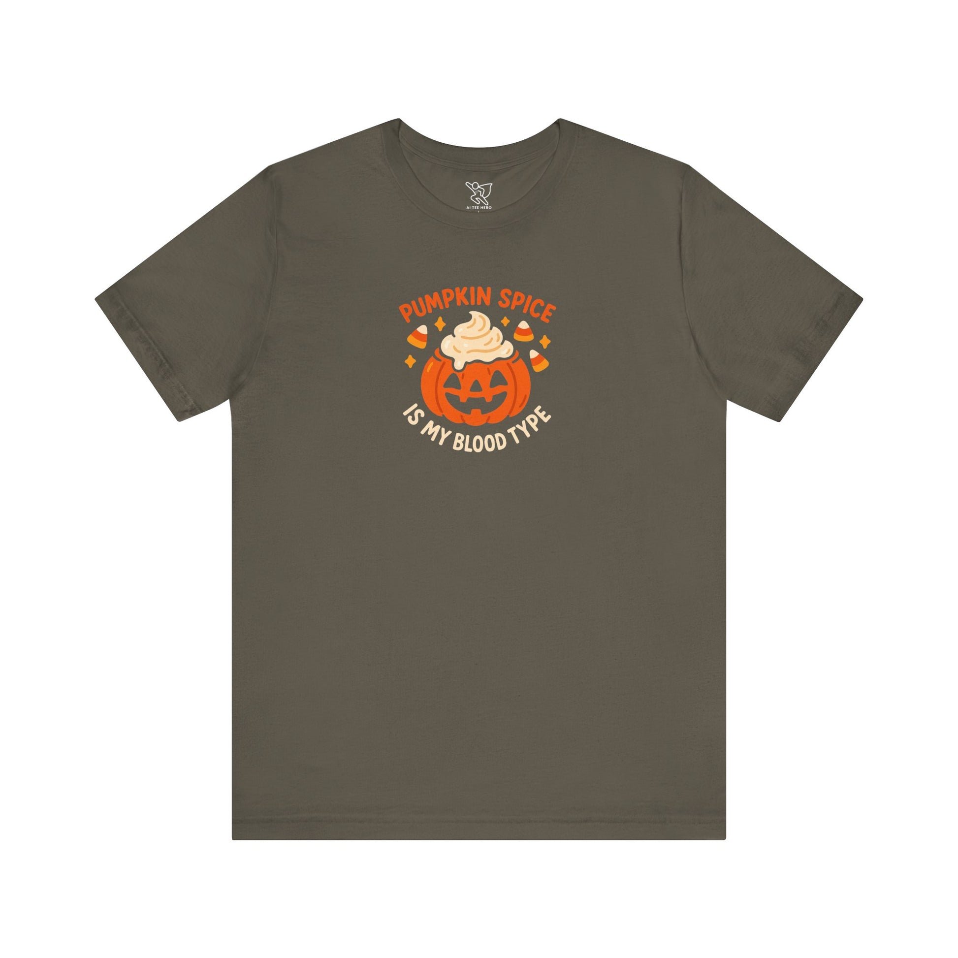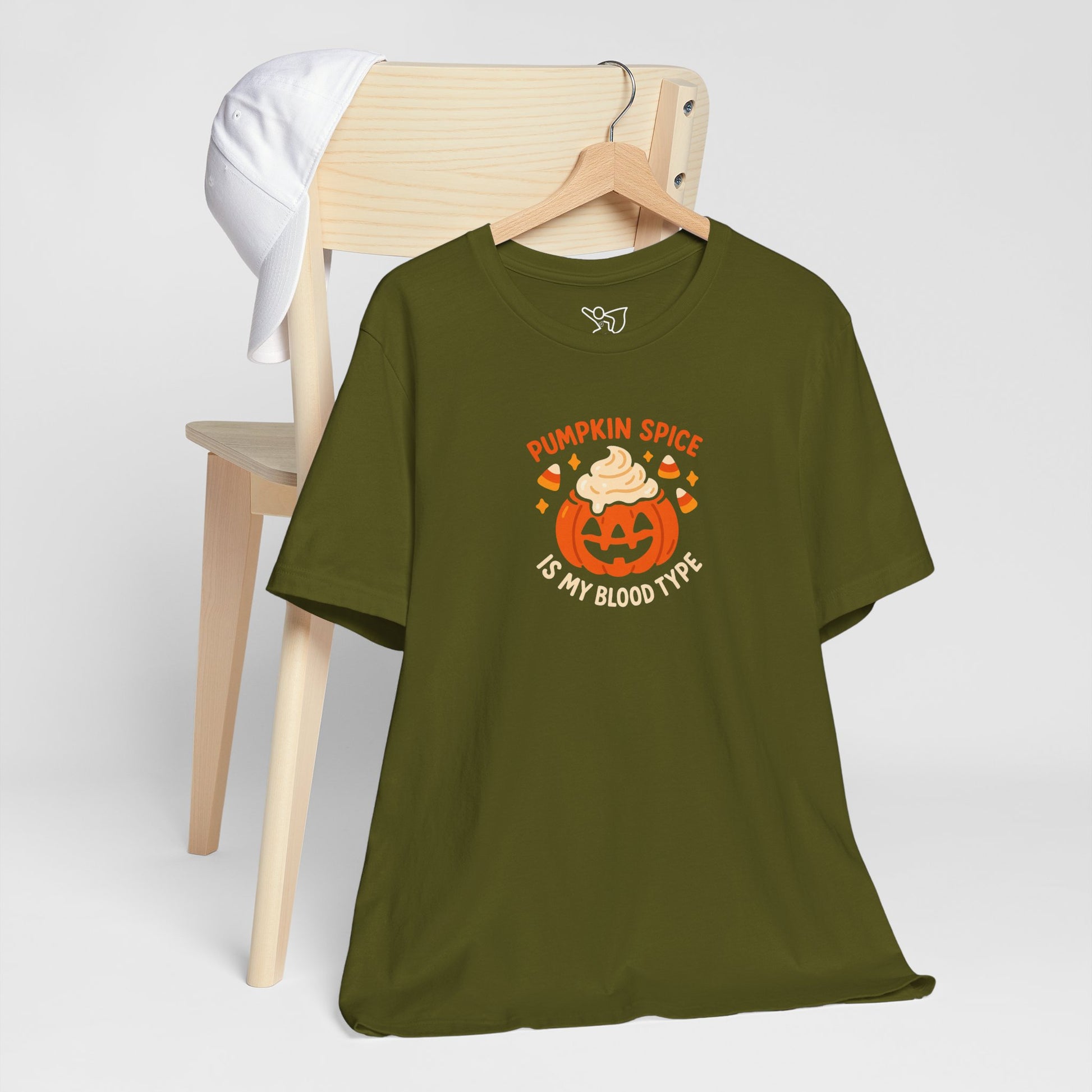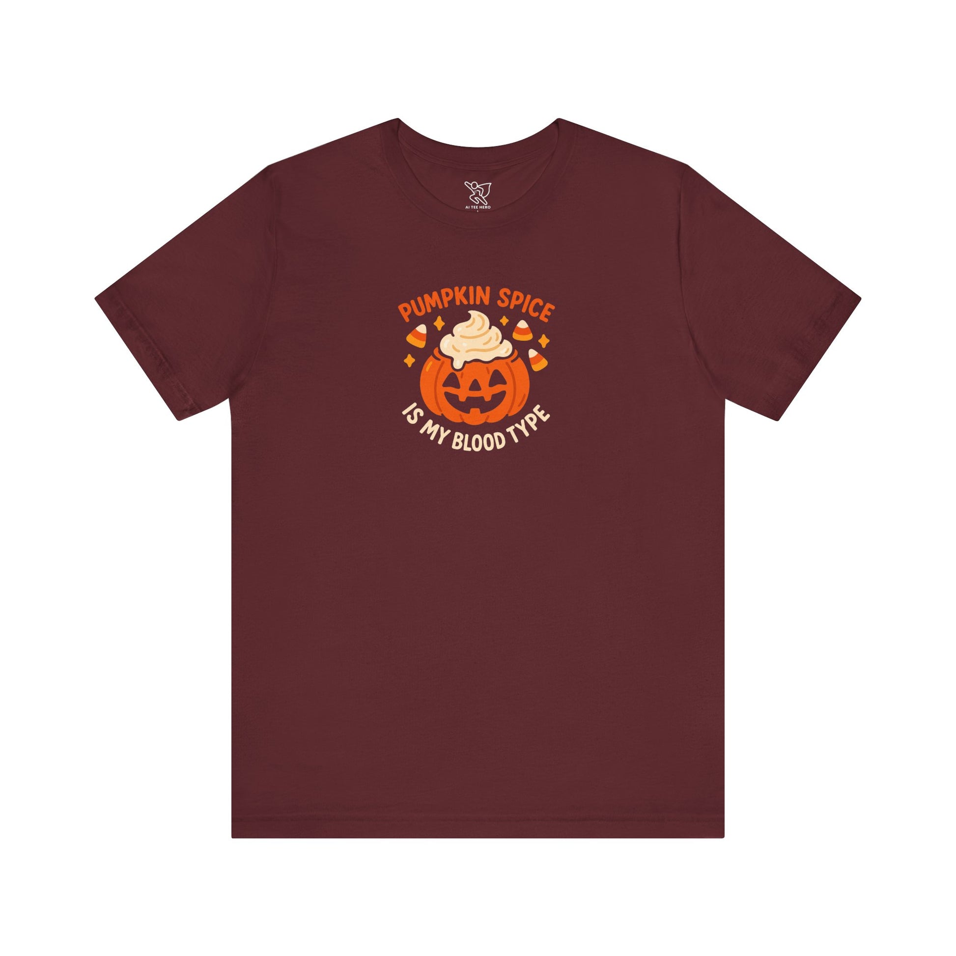 "Pumpkin Spice is My Blood Type" Short Sleeve Tee Fall Fashion, Halloween Shirt, Coffee Lover Gift, Autumn Wardrobe, Seasonal Tee